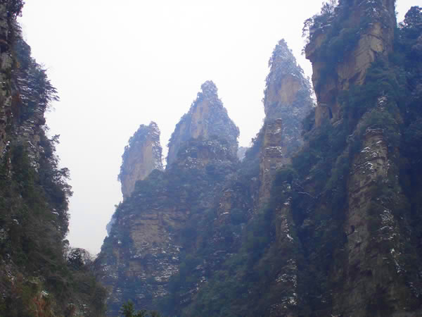 百丈峽圖片 凡到過索溪峪的人,都知道黃龍洞和寶峰湖,卻不一定知道那里還有個百丈峽。一個十分野氣的地方。是的 一級級不規(guī)則的坡田,傍著不被人注意的小山。山腳下蜿蜒一條溪流,幾乎看不到水。只憑一些雜亂的卵石才能辨認(rèn)出來。那溪流的出山之處,便是百丈峽口。幾條既是田埂又兼小路的窄徑,將我引到峽口。啊!一下子眼界大開,驚喜得叫了一聲。好偉麗的山,好嵯峨的峰!縱目觀去,不遠的峽正中,一峰拔地豎起,似一條巨大的桿魚,頭在半空,尾藏溪中,蔚為壯觀,一下子便吸引了我。