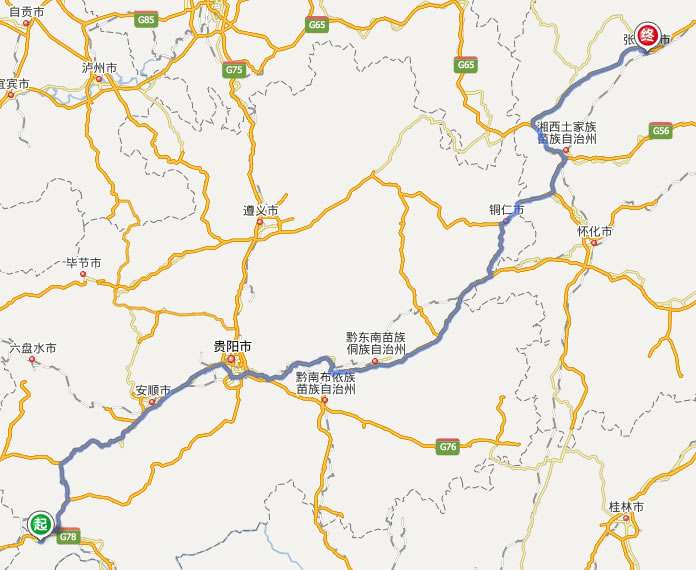 左右,沿途經過興義——安順——貴陽——貴定縣——麻江縣——凱里市——臺江縣——劍河縣——玉屏侗族自治縣——銅仁——鳳凰古城——吉首市——花垣縣——保靖縣——張家界市。