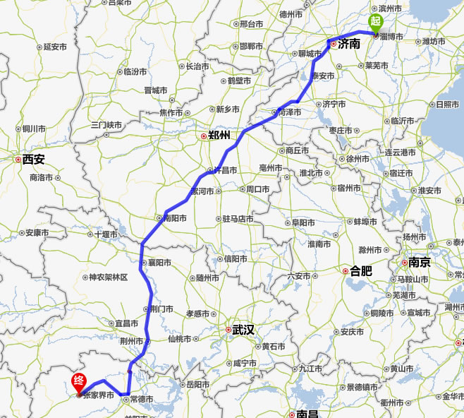 左右,沿途經過淄博——濟南——東平縣——菏澤市——蘭考縣——許昌市——平頂山——南陽——襄陽——荊門——荊州——常德(也可以走國道經澧縣、石門縣)——慈利——張家界。