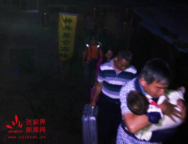 晚上9時許,由天子山景區(qū)管委會干部職工、居委會居民組成的應(yīng)急隊伍冒雨趕到老屋場,對入住游客和當(dāng)?shù)鼐用褚灰贿M(jìn)行耐心解釋,勸導(dǎo)他們連夜轉(zhuǎn)移到安全地帶。