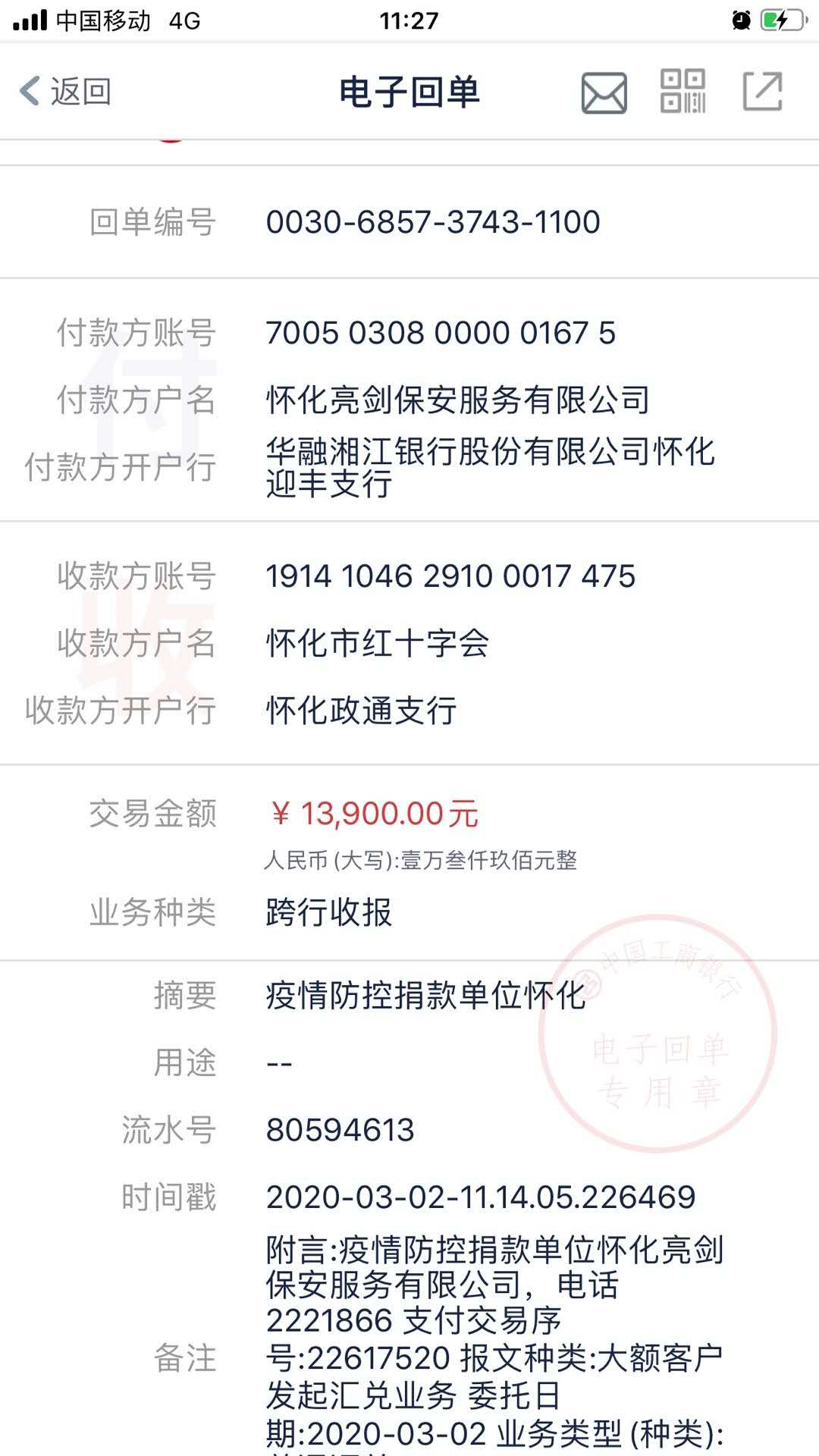 一方有難,八方支援。 懷化金劍、亮劍保安公司在組織保安隊(duì)員投入疫情防控阻擊戰(zhàn)的同時(shí),積極響應(yīng)以習(xí)近平同志為核心的黨中央的號(hào)召,為支持新冠肺炎疫情防控工作踴躍捐款。 該公司領(lǐng)導(dǎo)率先垂范,帶頭捐款,公司黨員、保安隊(duì)員踴躍參加捐款,以實(shí)際行動(dòng)支援抗疫工作。截止目前,全公司150余人自愿捐款1.3萬(wàn)余元。