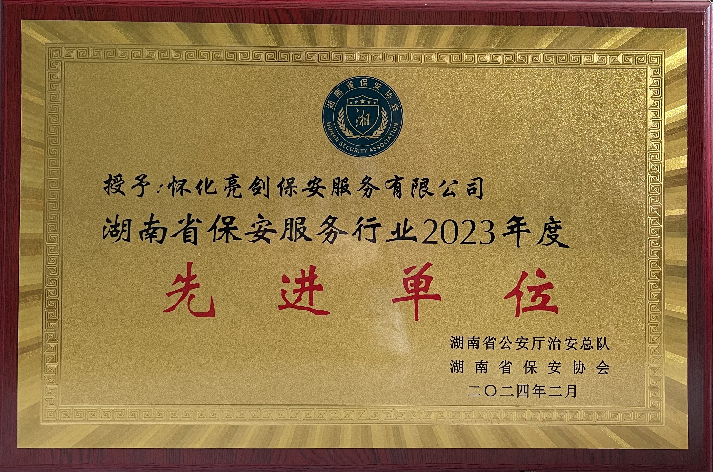 2023年,懷化亮劍保安服務有限公司、懷化金劍保安服務有限公司堅持以習近平新時代中國特色社會主義思想為指導,深入貫徹習近平法治思想,全面貫徹黨的二十大精神,牢牢把握保安服務工作總體要求,忠實履職服務大局,深耕保安服務主業(yè),著力加強自身建設,各項保安服務工作取得新跨越。據(jù)湖南省保安協(xié)會《湖南省保安服務行業(yè)2023年度先進集體、優(yōu)秀個人通報》,懷化亮劍保安服務有限公司榮獲湖南省保安服務行業(yè)2023年度先進單位,湖南省保安服務行業(yè)2023年度警保聯(lián)動先進單位,懷化金劍保安服務有限公司榮獲湖南省保安服務行業(yè)2023年度警保聯(lián)動先進單位,向其華,向紹前獲湖南省保安服務行業(yè)2023年度優(yōu)秀管理者榮譽稱號,公司保安隊員楊號賢、王幽、張發(fā)香、舒經亞等四人被評為湖南省保安服務行業(yè)2023年度優(yōu)秀保安員。