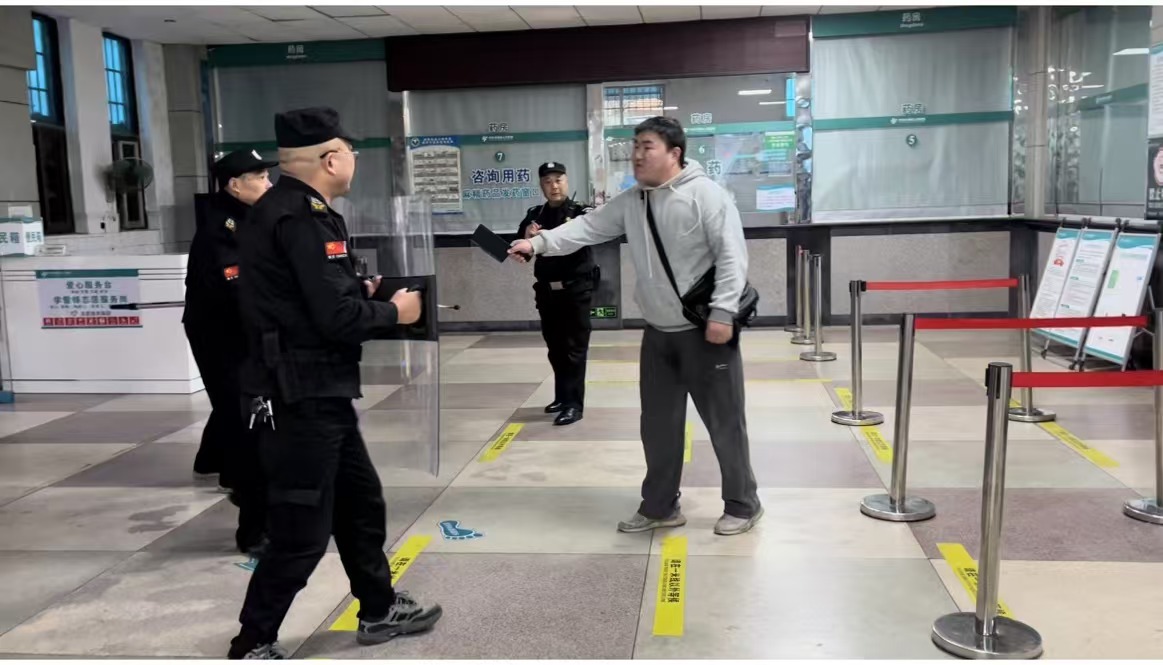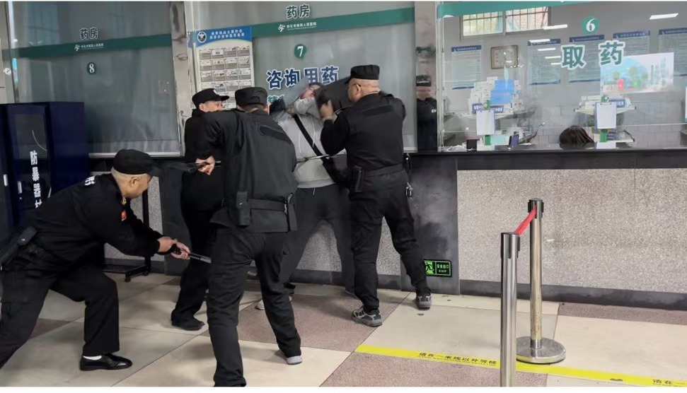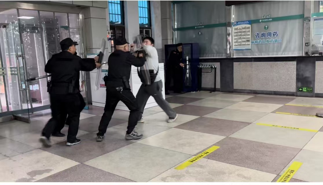 在確保自身安全的前提下,保安隊(duì)員使用防暴器材對(duì)歹徒進(jìn)行控制,并協(xié)助醫(yī)護(hù)人員將患者和家屬疏散至安全區(qū)域。